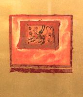 Gold paint, soft pastels, Birds' Nest paper from Thailand, alpaca weaving from Peru, handprint of 17th century painting on wood from India, photo fragments, broken metal edge of ruler.